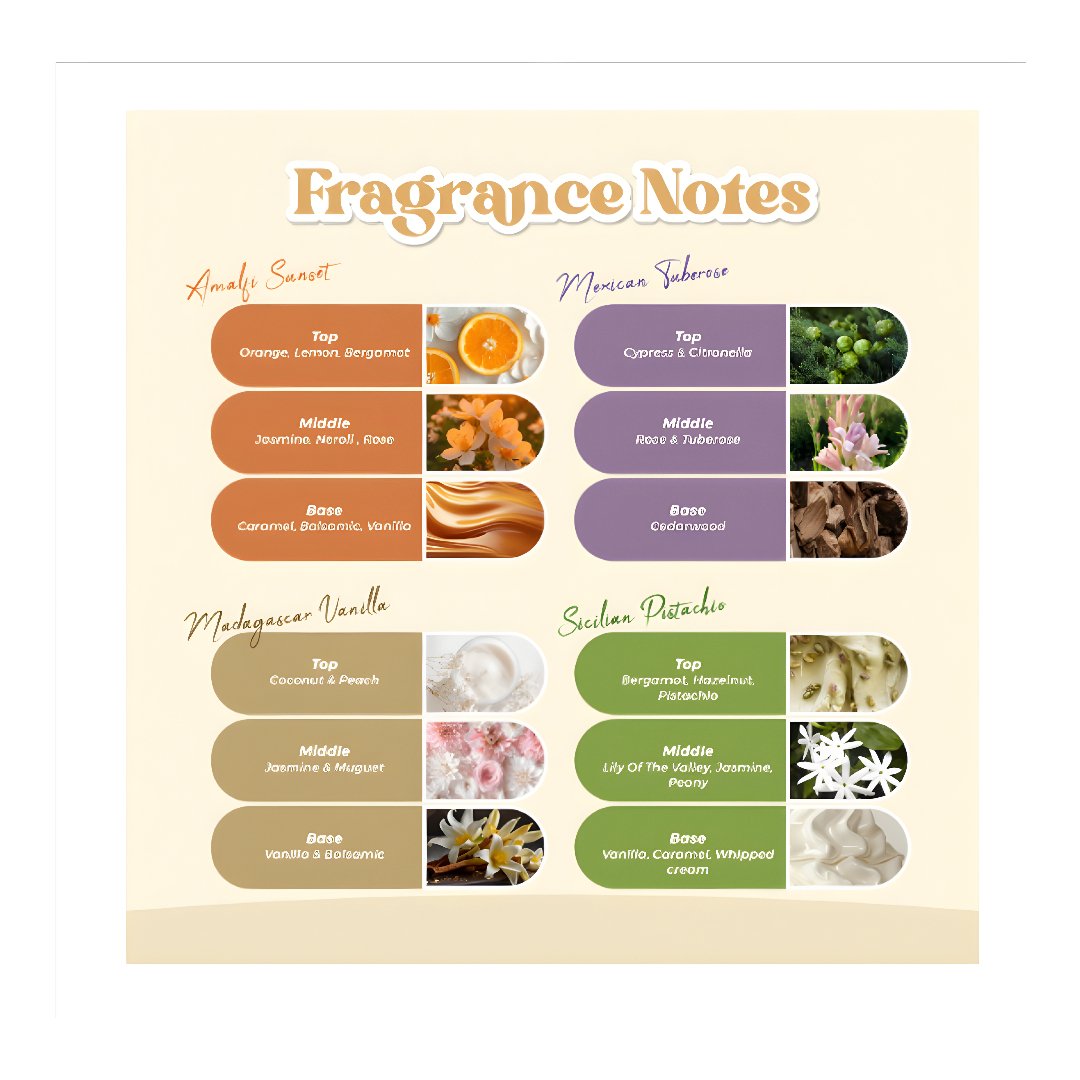 - A Scent for Every Mood – Indulge in a mix of nutty, citrusy, vanilla, and floral fragrances, suited for any occasion.